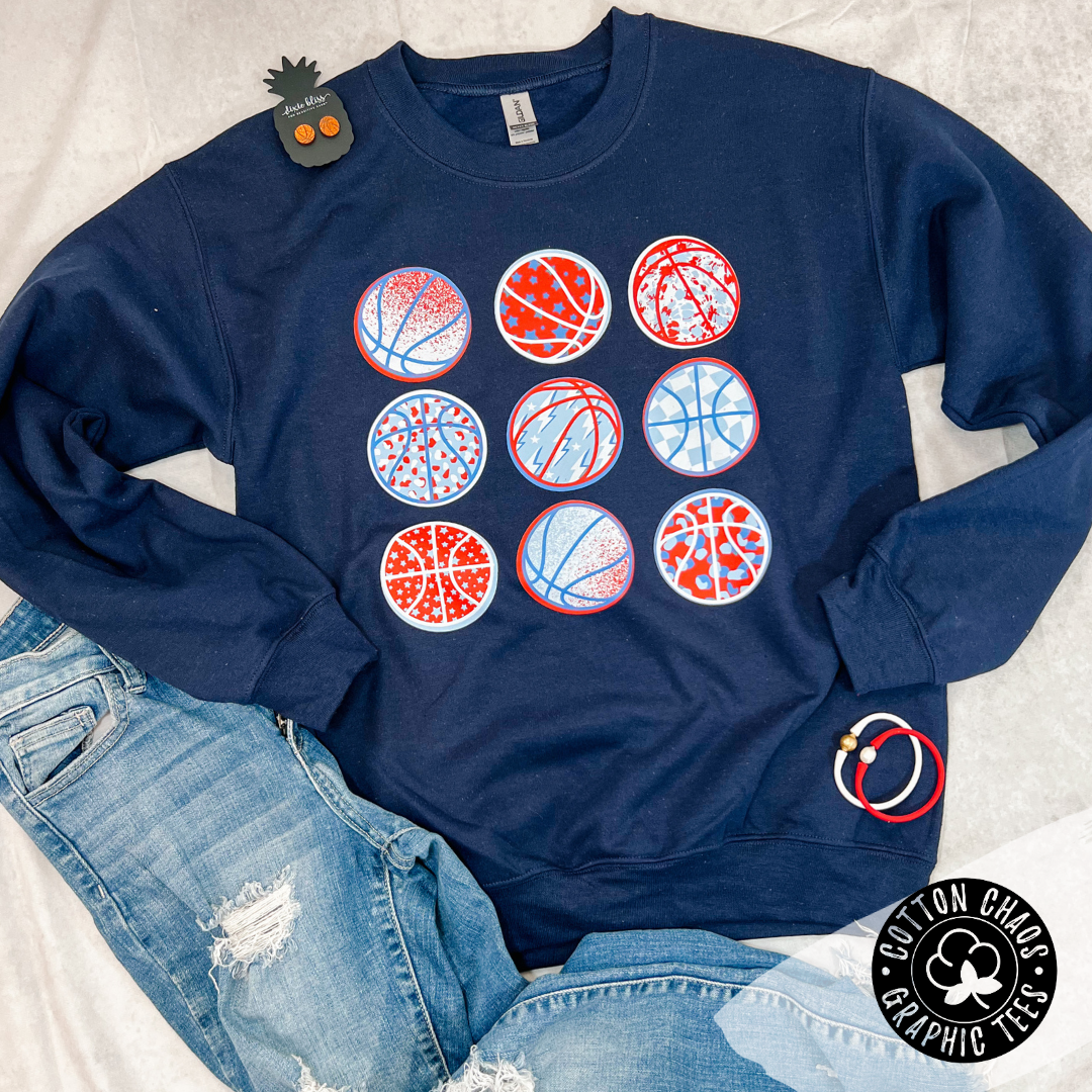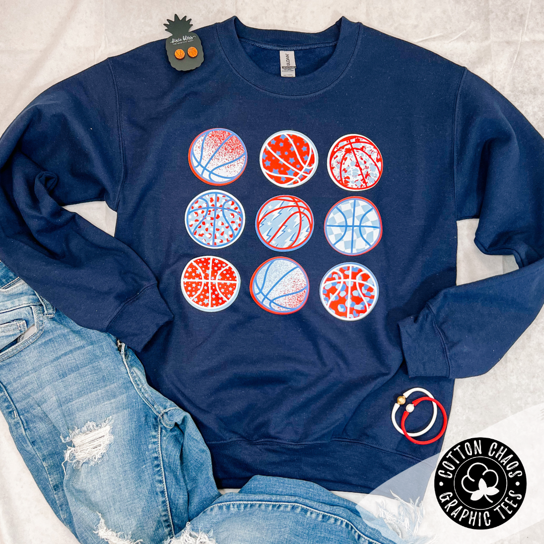 Stay warm and stylish at any basketball game with this playful nine-ball sweatshirt! The unique design featuring alternating red and blue basketballs is sure to turn heads. Cozy up in this one-of-a-kind sporty ensemble!
