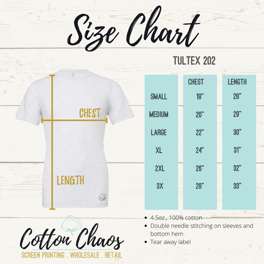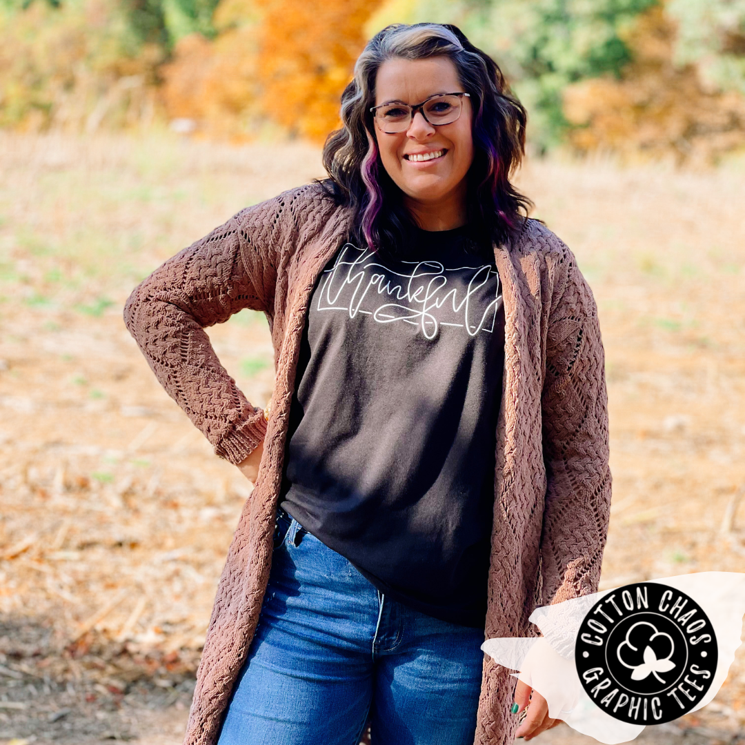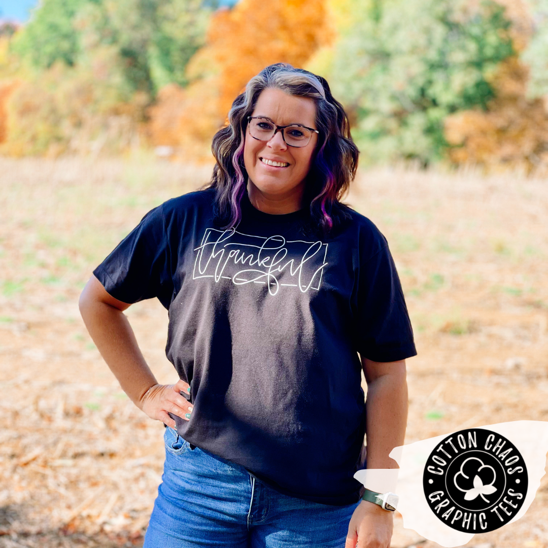 We're thankful for our little black tee! This basic tee can be worn all year and is perfect for layering or wearing on its own. Our Cotton Chaos graphic tees are soft, comfortable, and stylish. This tee is a must-have for any wardrobe.