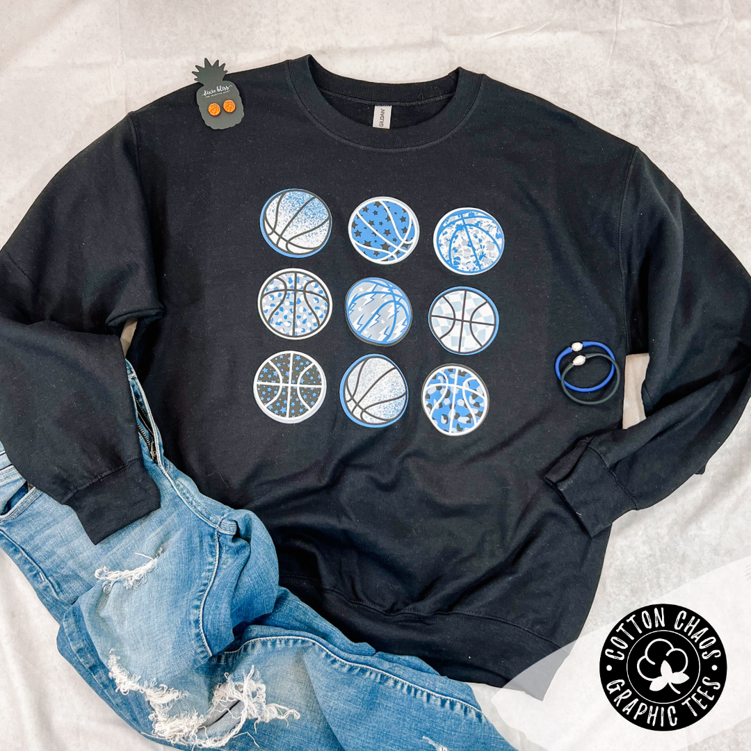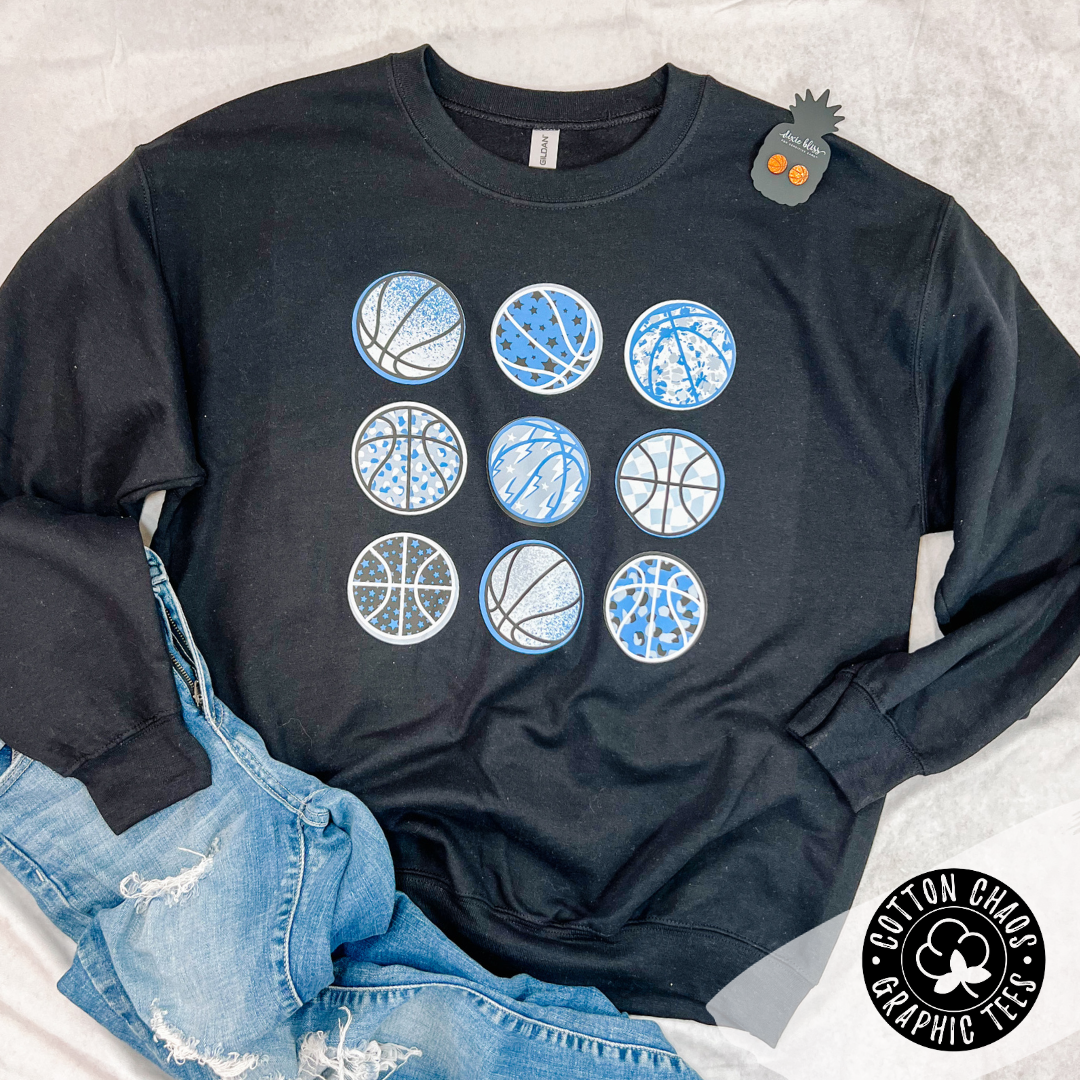 Stay warm and stylish at any basketball game with this playful nine-ball sweatshirt! The unique design featuring alternating red and blue basketballs is sure to turn heads. Cozy up in this one-of-a-kind sporty ensemble!